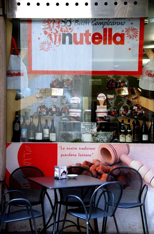 50 Jahre Nutella – ein guter Grund zu feiern. In Alba, der Stadt in der die Firma Ferrero ihren Hauptsitz hat, feiern alle mit. Kaum ein Geschäft in der Innenstadt, das in seinem Schaufenster nicht an das prominente Geburtstagskind erinnert. Andreas, ein Gast unserer Cascina Cerea, hat bei einem Besuch der Stadt diese Hommage an eine Nusskreme im Bilde festgehalten. Ihm verdanken wir diese herrlichen Fotos.