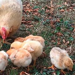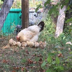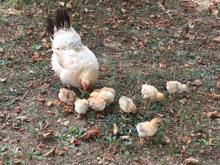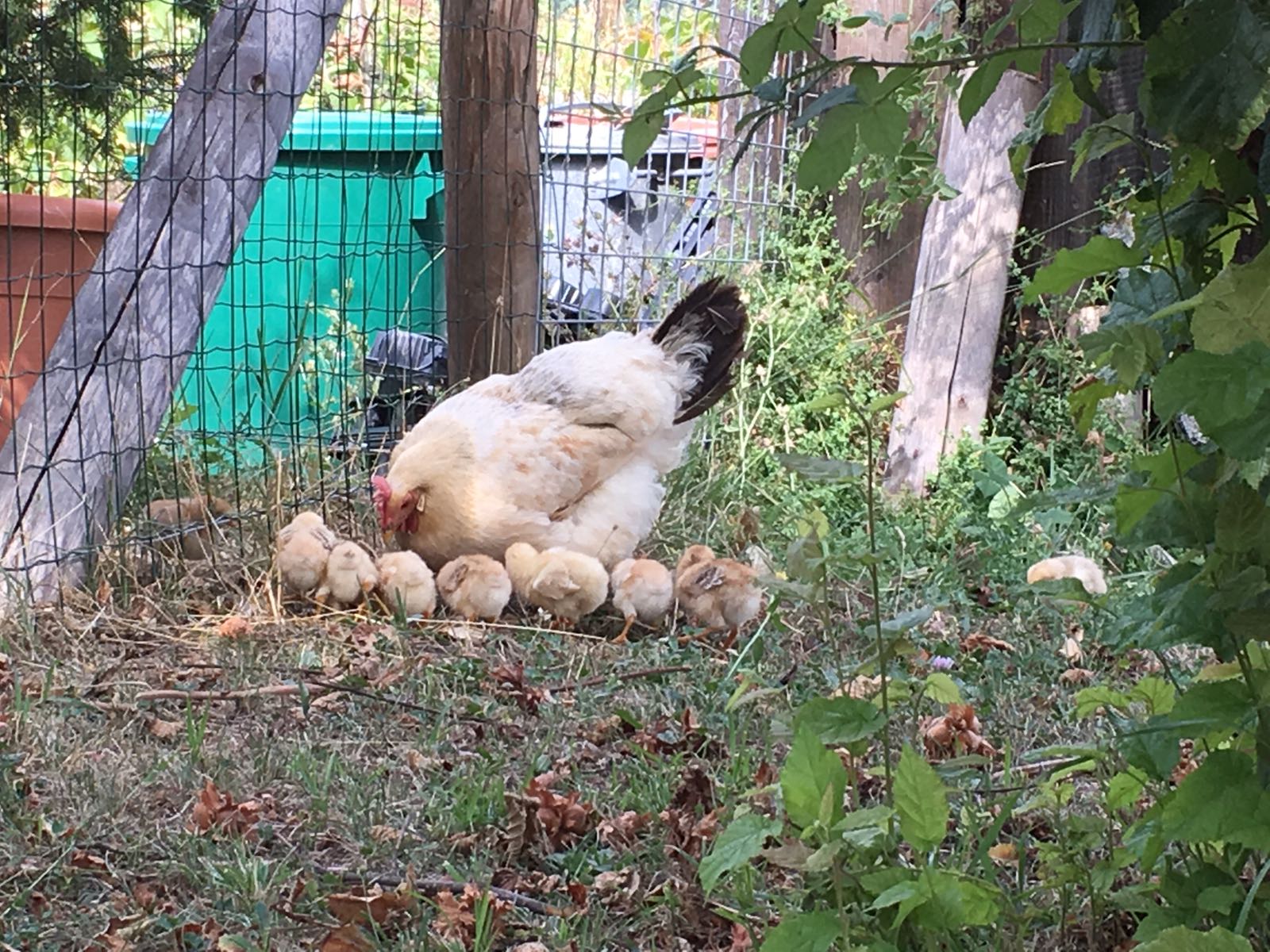 Die sorgen jetzt für Nachwuchs, eine Glucke mit acht Küken wohnt in einer Dependance des Hühnerstalls, die kleinen schlüpfen noch durch den Zaun, die Mama überwindet mühevoll das 1,80 Meter hohe Hindernis und gemeinsam scharren und picken sie im Sonnenblumenfeld. Abends gehen alle brav von ganz alleine in ihr Hühnerhaus, Jens macht dann die Klappe zu und wünscht ihnen eine gute Nacht.