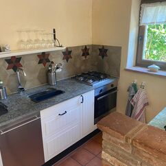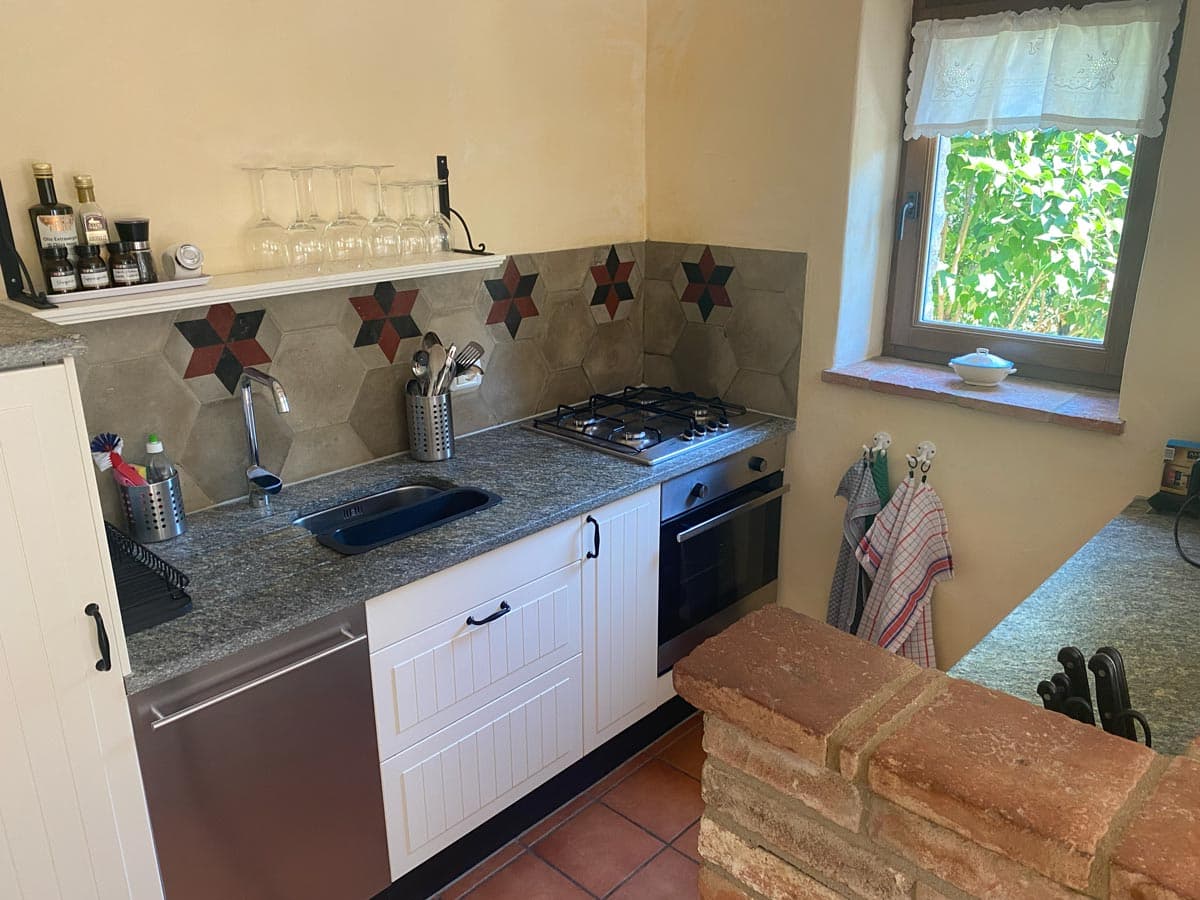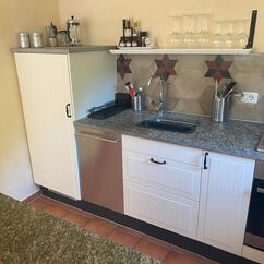 - Komplett ausgestattete Wohnküche mit Küchentheke, Gaskochfeld, Elektrobackofen, Geschirrspülmaschine und Kühlschrank mit Gefrierfach