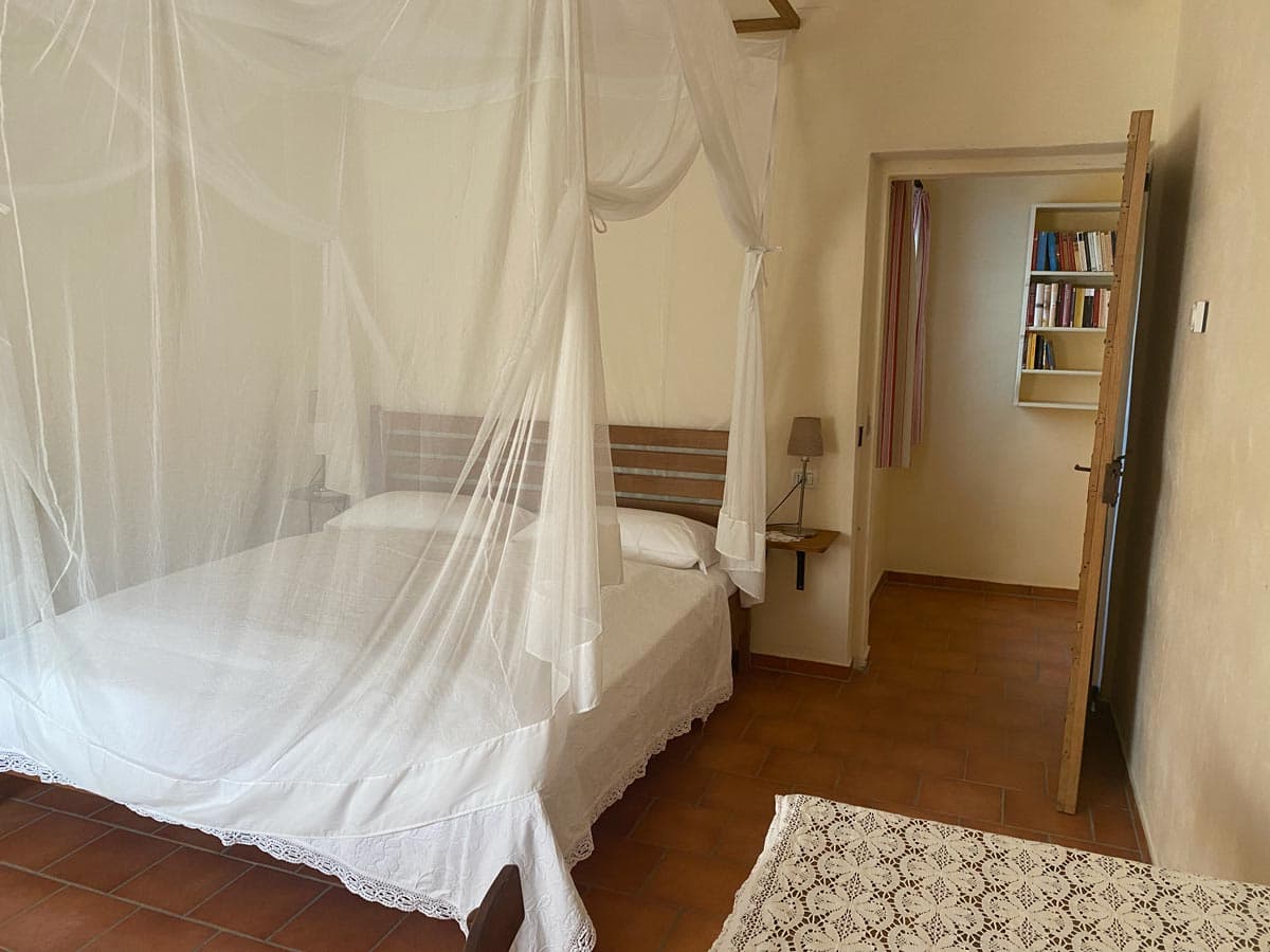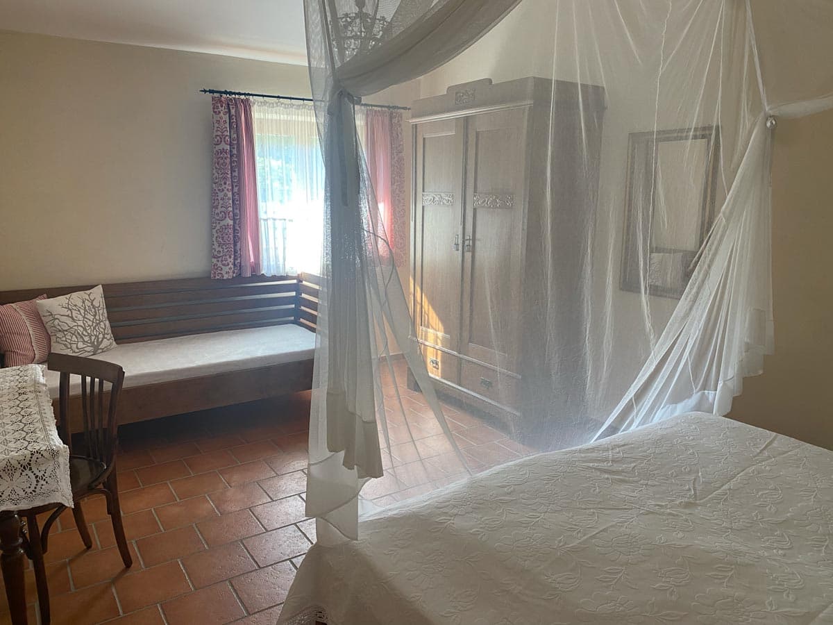 - Ein Schlafzimmer mit Doppelbett, Schlafsofa und bei Bedarf ein weiteres Einzelbett
