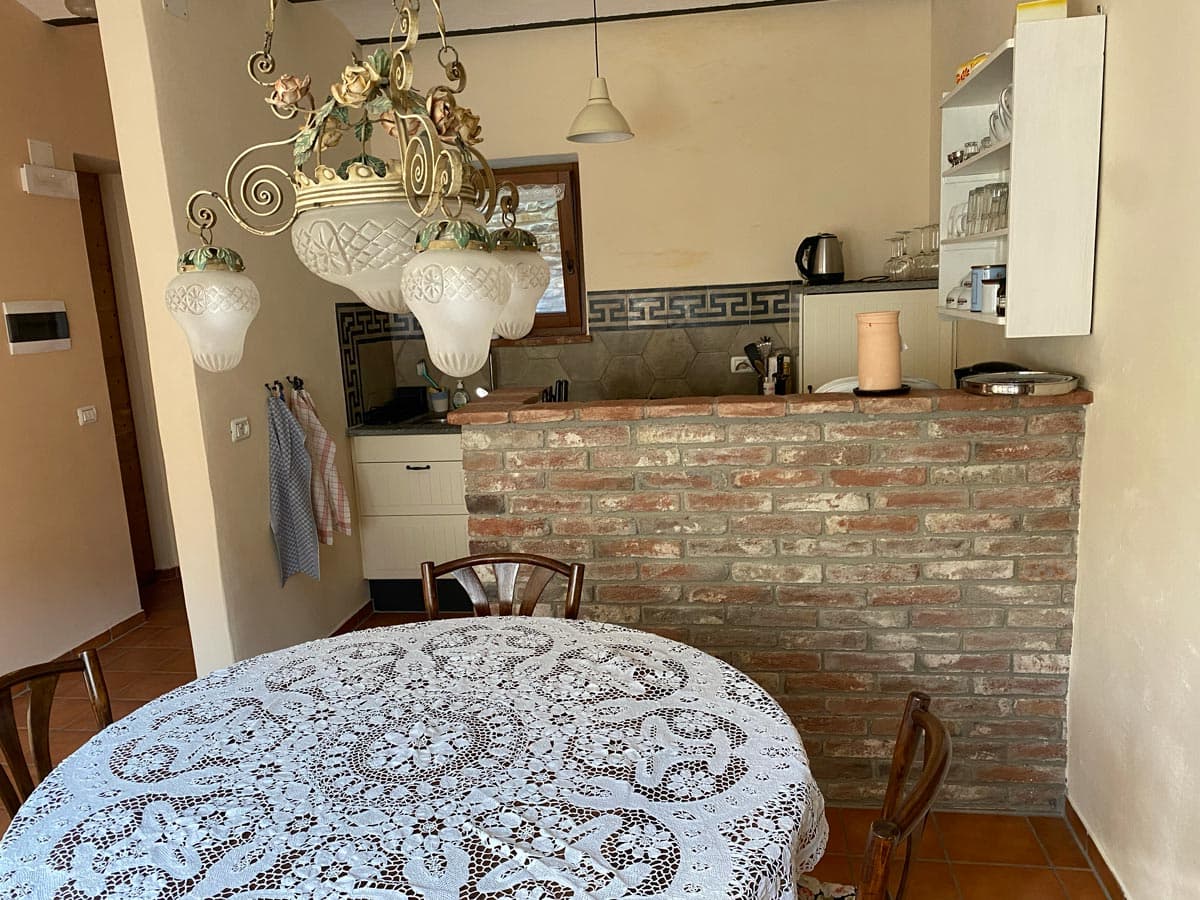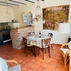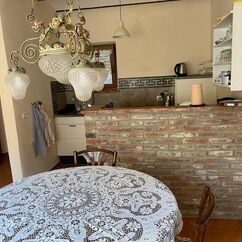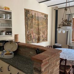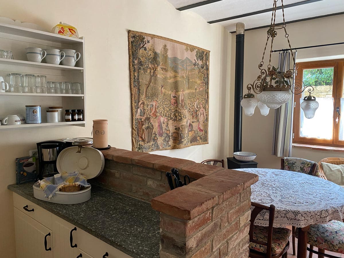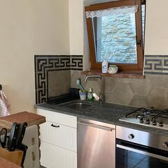 - Komplett ausgestattete Wohnküche mit Küchentheke, Gaskochfeld, Elektrobackofen, Geschirrspülmaschine und Kühlschrank mit Gefrierfach
